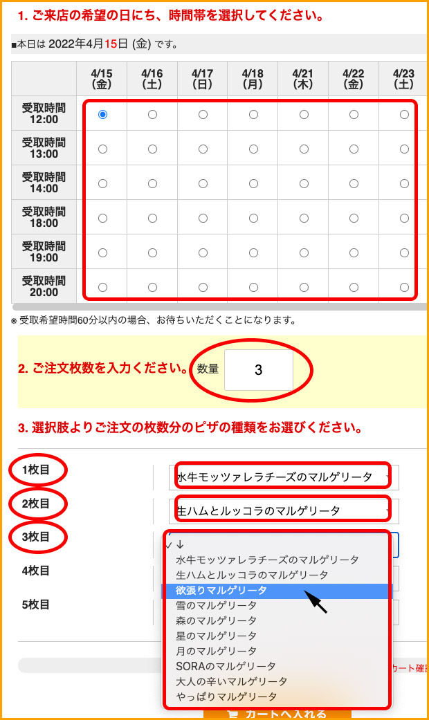 受取ご希望の時間に合わせてお選びください。 - 数量欄にご注文枚数を入力してください。