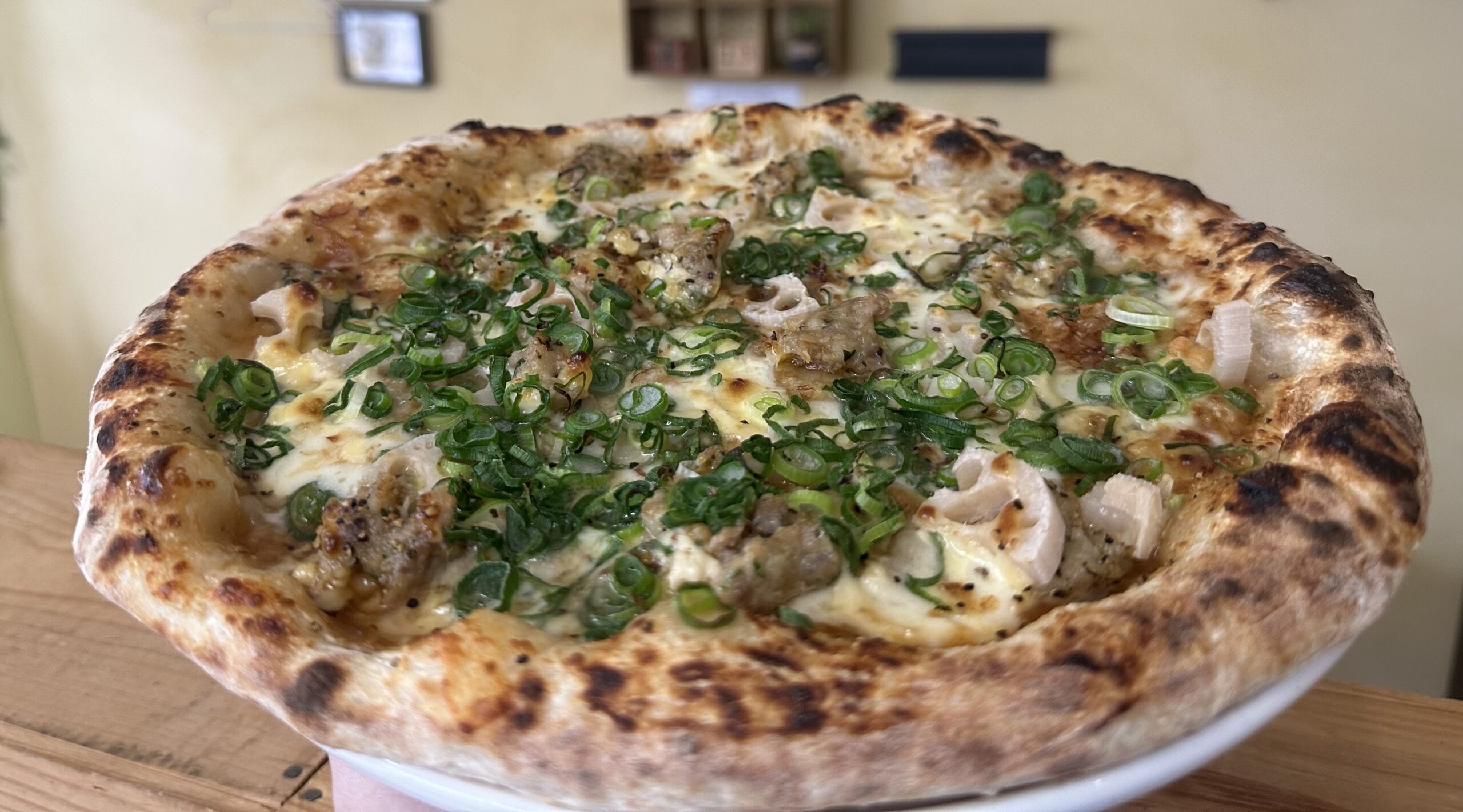 山椒照り焼きソース、自家製サルシッチャ、蓮根、モッツアレラ、ねぎ、削り節、自家製マヨネーズ